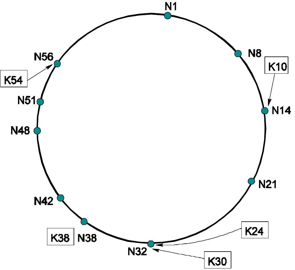 Asignación de claves a nodos: la clave $k$ se asignará al nodo número $k$ si está disponible, o a aquel nodo inmediatamente superior a $k$. Por tanto, la clave $k$ estará en un nodo $n$ de forma que $k \le n$.
