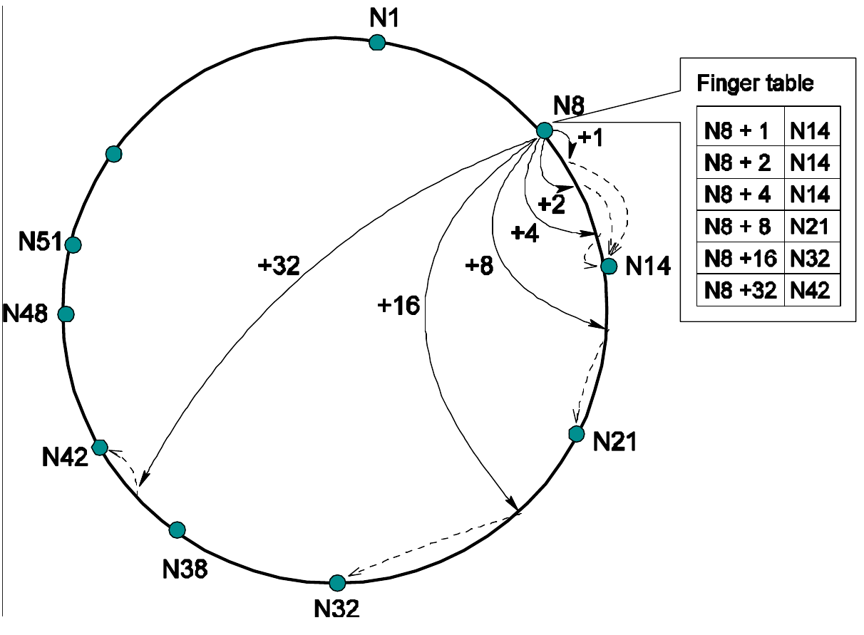 - Cada nodo tiene una tabla (a veces llamada finger table) que almacena los $O(\log_2 N)$ nodos siguientes.