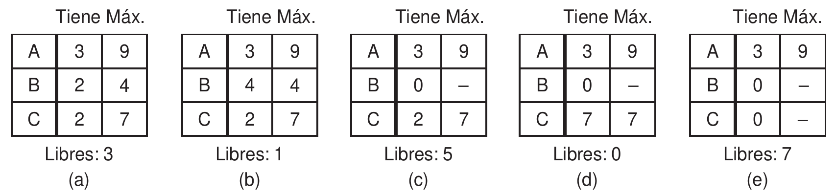- Suponer que el proceso seleccionado solicita todos los recursos que necesita: $C_i := C_i + R_i$. Luego, se asume que el proceso termine y libere todos los recursos: $A := A + C_i$. Como el proceso terminó, se marca como completado: $R_i := (0 \ldots 0)$.